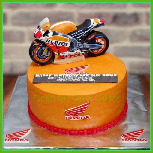 Birthday Cake dengan tema motor Honda MotoGP, model tersebut mulai ukuran 30 cm dan motor 24 cm, daftar harga kue ulang tahun https://coklatchiccake.com/daftar-harga-2