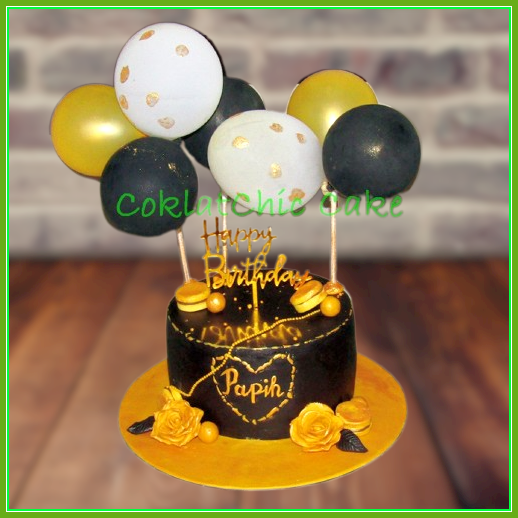 Birthday Cake dengan tema special black gold balon, model tersebut mulai ukuran 20 cm, daftar harga kue ulang tahun https://coklatchiccake.com/daftar-harga-2