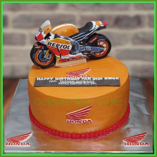 Birthday Cake dengan tema motor Honda MotoGP, model tersebut mulai ukuran 30 cm dan motor 24 cm, daftar harga kue ulang tahun https://coklatchiccake.com/daftar-harga-2