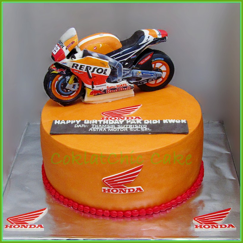 Birthday Cake dengan tema motor Honda MotoGP, model tersebut mulai ukuran 30 cm dan motor 24 cm, daftar harga kue ulang tahun https://coklatchiccake.com/daftar-harga-2