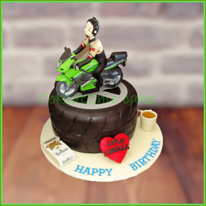 Birthday Cake dengan tema motor kawasaki Ninja, model ini mulai ukuran 18 cm, daftar harga kue ulang tahun https://coklatchiccake.com/daftar-harga-2
