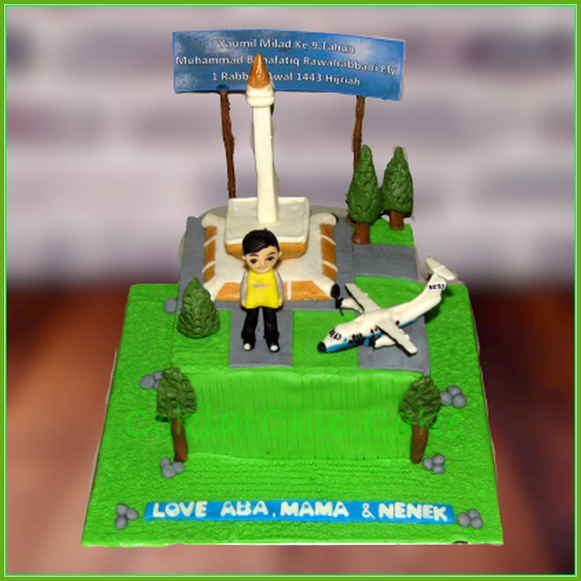 Birthday Cake dengan tema Monas dan Pesawat N250, model ini mulai ukuran 15 cm, daftar harga kue ulang tahun https://coklatchiccake.com/daftar-harga-2