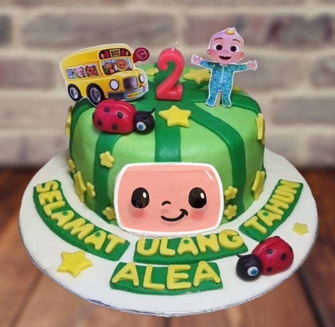 Birthday Cake dengan tema baby bus Cocomelon, model tersebut mulai ukuran 15 cm , daftar harga kue ulang tahun https://coklatchiccake.com/daftar-harga-2