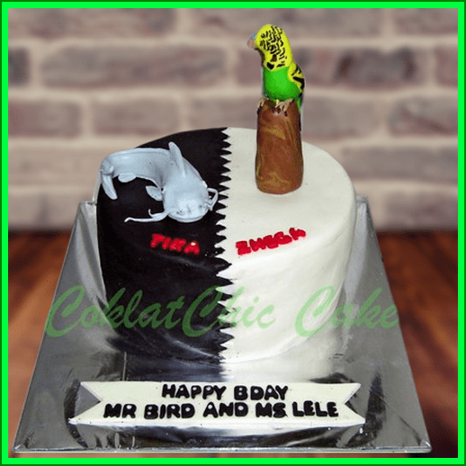 Birthday Cake dengan tema catfish and bird, model tersebut mulai ukuran 20 cm dan minicake 6 cm, daftar harga kue ulang tahun https://coklatchiccake.com/daftar-harga-2