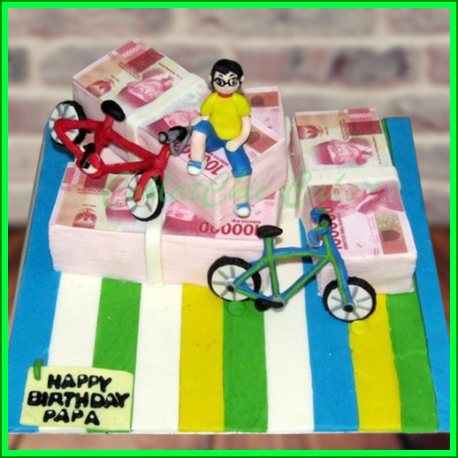 Birthday Cake dengan tema Uang dan Sepeda , model tersebut mulai ukuran 20 cm , daftar harga kue ulang tahun https://coklatchiccake.com/daftar-harga-2