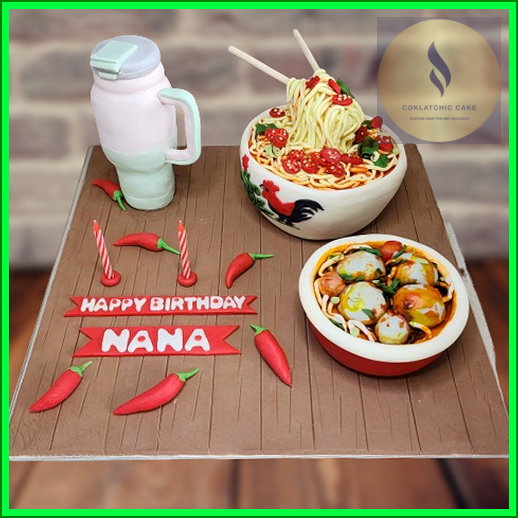 Birthday Cake dengan tema Mie Bakso Rawit, model tersebut mulai ukuran 15 cm , daftar harga kue ulang tahun https://coklatchiccake.com/daftar-harga-2