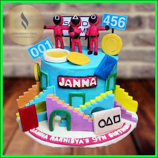 Birthday Cake dengan tema Squid Game, model ini mulai ukuran 20 cm tinggi, daftar harga kue ulang tahun https://coklatchiccake.com/daftar-harga-2