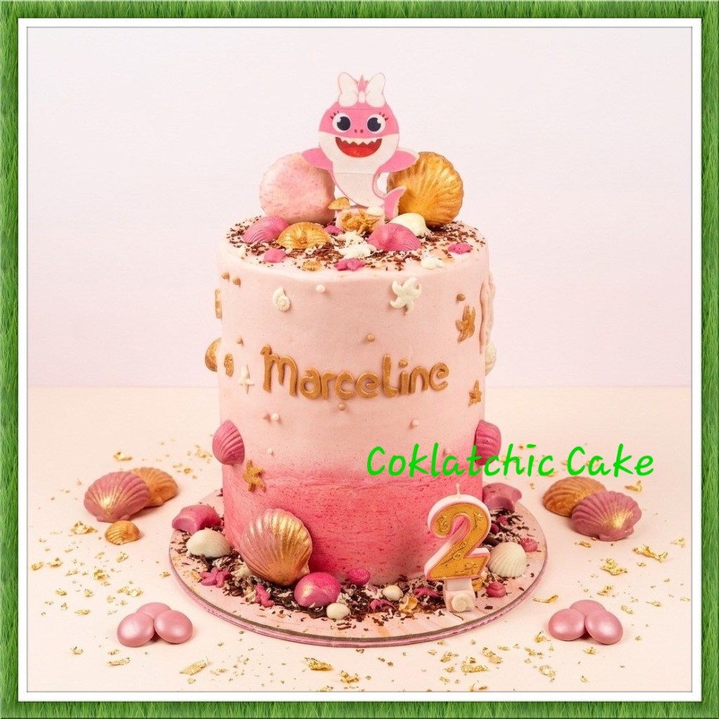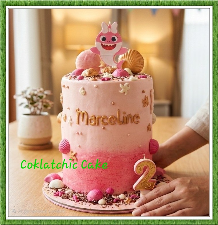 Perpaduan warna pink lembut, dekorasi kerang, dan karakter lucu di atasnya.