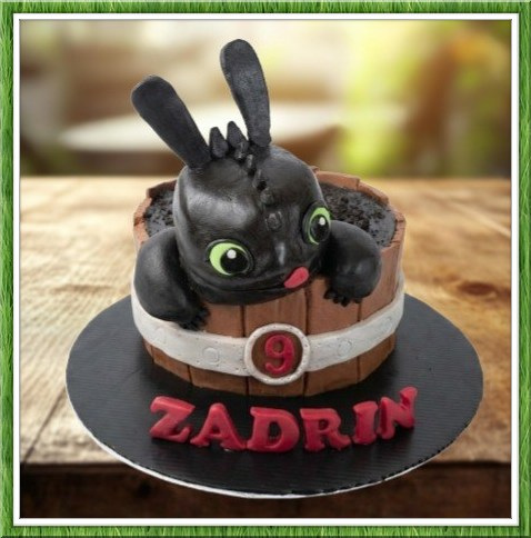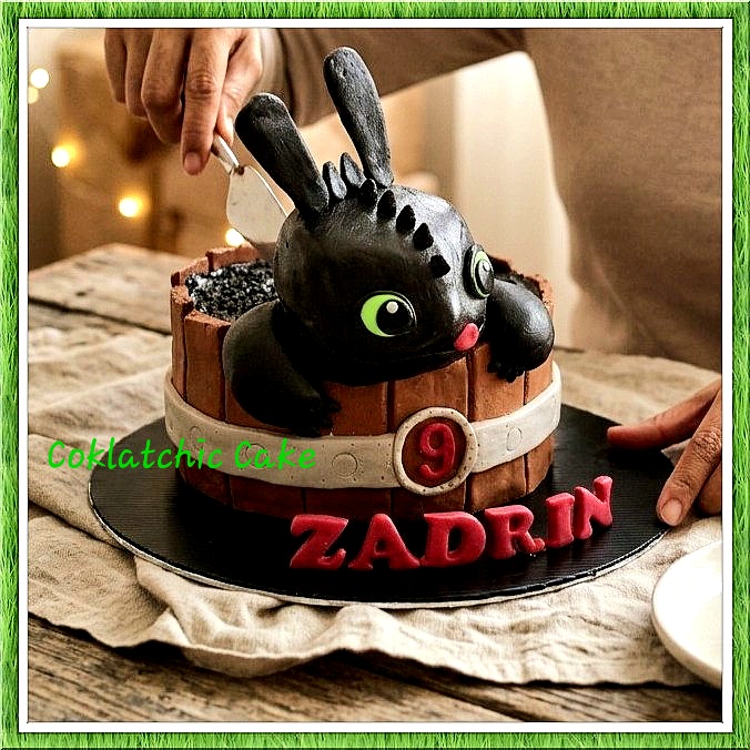 Kue spesial bertema How to Train Your Dragon ini dibuat dengan penuh cinta menggunakan coklat untuk hiasan dan lapisannya. Tidak ada fondant, sugar icing, atau buttercream ā yang menciptakan sosok Night Fury kesayangan kita!
