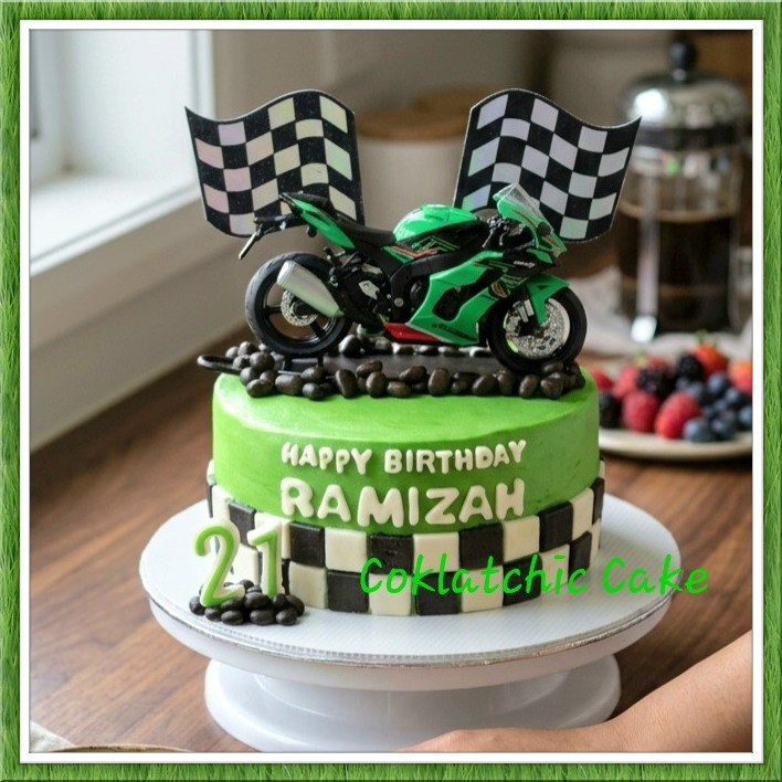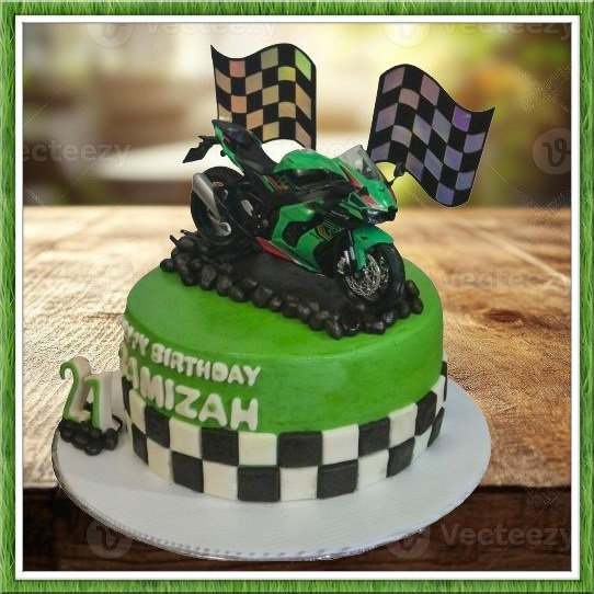 Cake motor sport ini tampil sporty dengan detail jalanan, bendera race, sampai motor kece di atasnya.